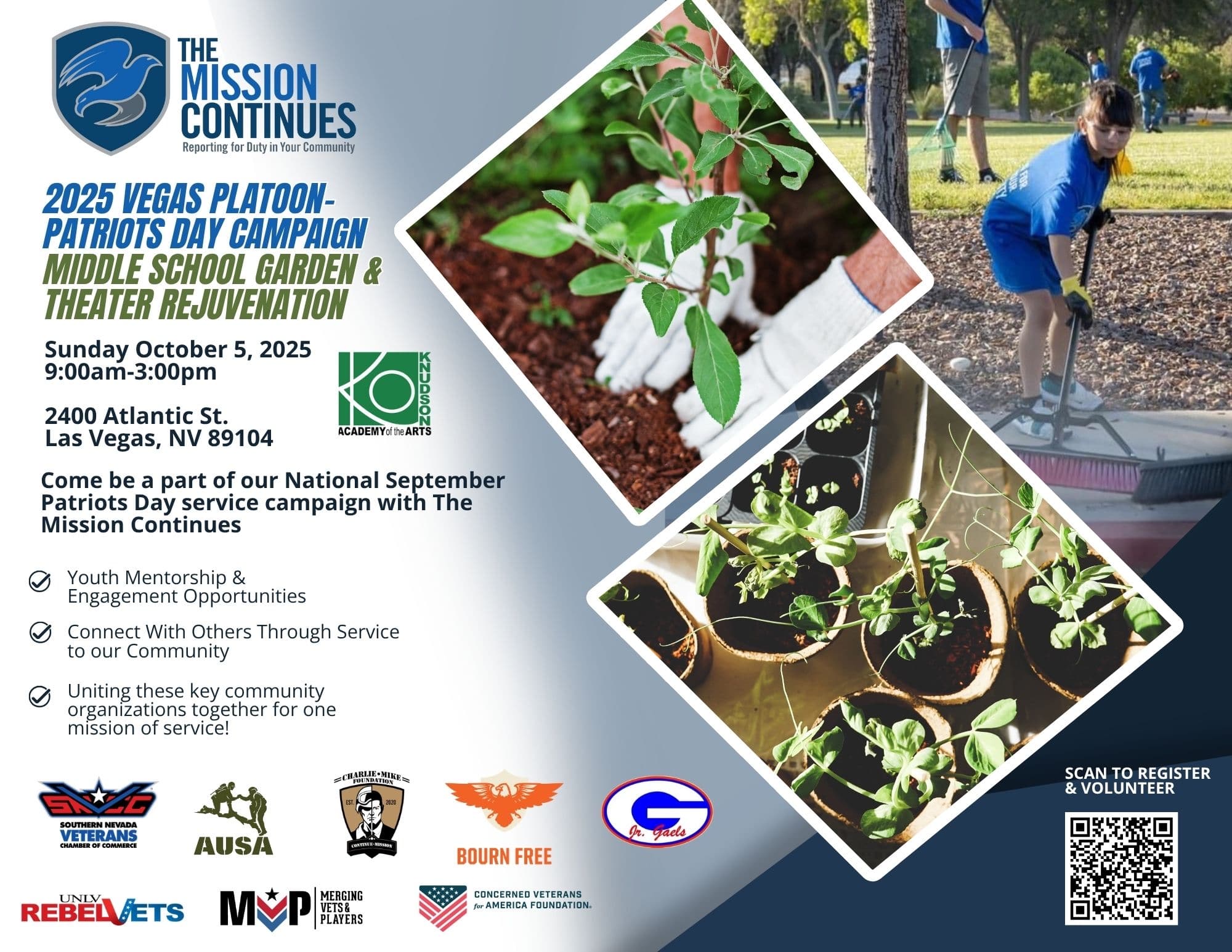 For 2025 Las Vegas Platoon 9/11 campaign, we are excited to partner with CCSD Middle School, KO Knudsen Academy of the Arts, to work together to create a rejuvenated environment for our youth and future artists, musicians, and performers to grow and learn! We will be bringing a great friend and community favorite, USMC Veteran and gardening guru, Matt Nelson to share guidance on improving quality of irrigation systems and soil quality for the student garden at KO Knudsen. We will also be gathering materials and willing volunteers to construct benches and tables for our student to better learn concepts in outdoor gardening at KO Knudsen. In addition, we will be bringing volunteers together to help bring to new life the KO Knudsen training theater room, so our young performers can have the setting they want and need to grow and flourish! Veterans, military members veteran supporters, local youth, and community partners all gathering to build amazing connection and get some meaningful work done for our Las Vegas youth! Type Service Project What To Wear TMC blues, Clothes that can get dirty, Painting clothes Accessibility Wheelchair accessible site and bathrooms;Handicap Parking available;Jobs available for persons with limited mobility Who’s Invited […]
